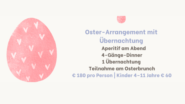 Preisinformation Osterbrunch: Erwachsene: € 58 Kinder (4–11 Jahre): € 25 Oster-Arrangement mit Übernachtung Preis: € 180 pro Person Kinder (4–11 Jahre): € 60