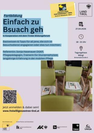In Kooperation mit dem Tiroler Bildungsforum Diese Fortbildung vermittelt Basiswissen und praktische Tipps für alle, die sich im Besuchsdienst engagieren oder künftig engagieren möchten.