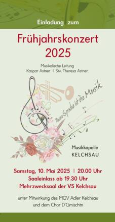 Die Musikkapelle Kelchsau lädt zum traditionellen Frühjahrskonzert in der Mehrzweckshalle der Volksschule Kelchsau ein. Alle Musikbegeisterten erwatet ein abwechslungsreiches Programm mit der Mitwirkung des Männergesangsverein Adler Kelchsau.