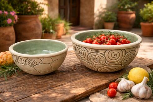 Wir gestalten, probieren Muster, arbeiten mit Stempeln und farbigem Tonschlicker (Engobe). Nach dem Schrühbrand bekommen die Stücke im Glasurbrand bei 1220 Grad ihr Finish - spülmaschinentauglich und frostsicher. Zwischendurch gibt's eine entspannte Mittagspause zum Durchatmen und Austauschen.