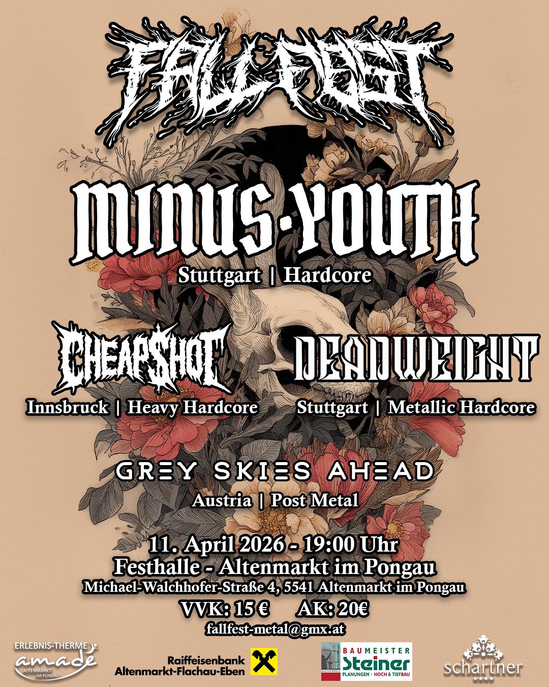 Beim Fallfest am 11. April wird die Altenmarkter Festhalle zur Rockarena. Die Bands Minus Youth & Cheapshot aus Stuttgart und Deadweight & Grey Skies Ahead aus Österreich erwarten euch mit fetten Riffs, donnernden Drums und einer unvergesslichen Atmosphäre. Geboten wird ein vielseitiger Sound von Prog-Rock und Post Metal bis zu Metalcore und Hardcore.