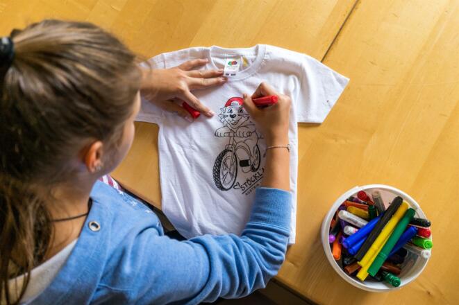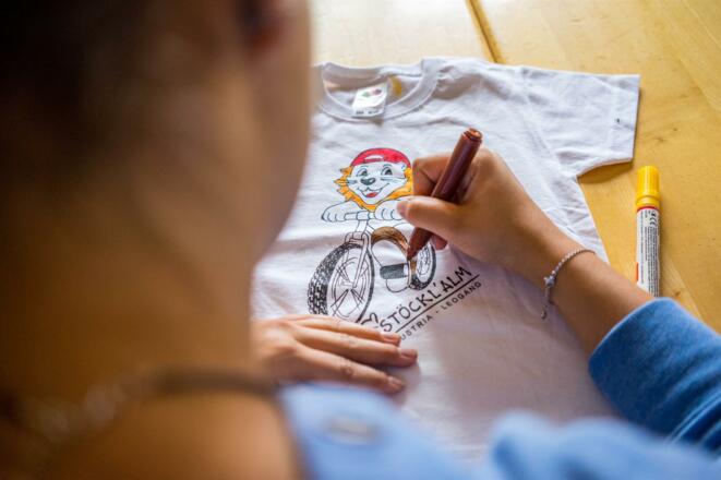 Jedes Kind kann sein eigenes tragbares Kunstwerk gestalten und sein fertiges Shirt mit nach Hause nehmen. Malen eignet sich auch gut bei Regenwetter! Ihr könnt uns am Samstagnachmittag im Sinne Park an der Stöcklalm zum Malen besuchen.