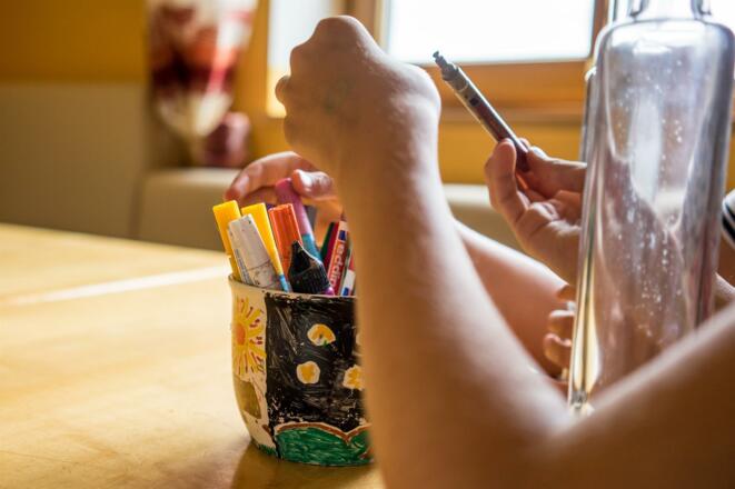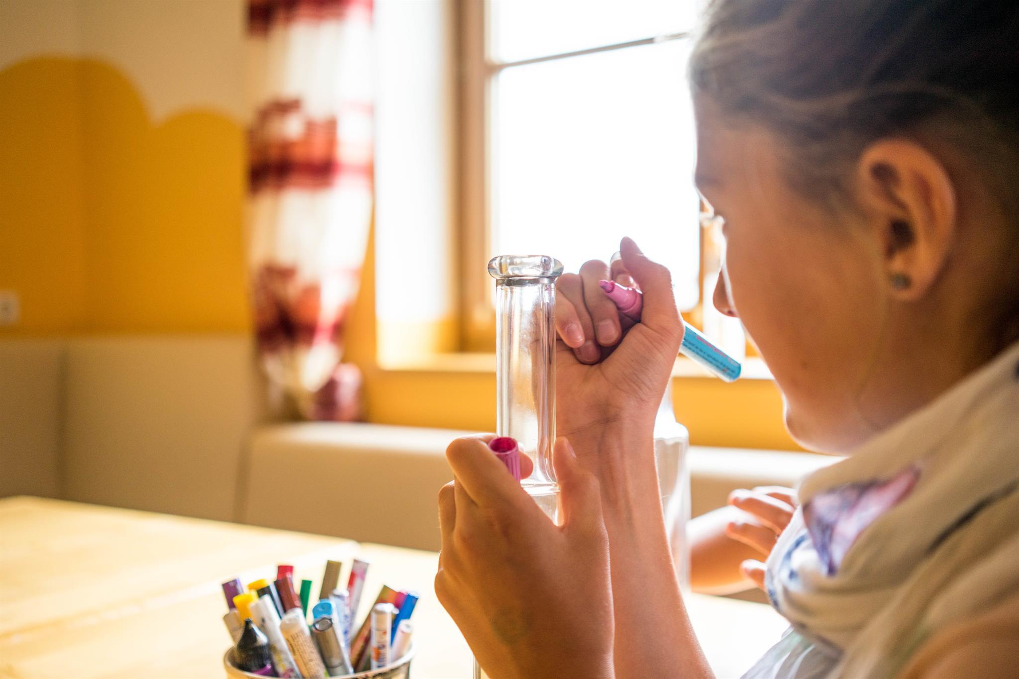 Verschiedenste Dinge und Materialien, wie Glasflaschen, können von den kleinen Malern verschönert werden. Auch bei Regenwetter treffen wir uns am Mittwochnachmittag im Sinne Park zur Mal-Werkstatt in der Stöcklalm.