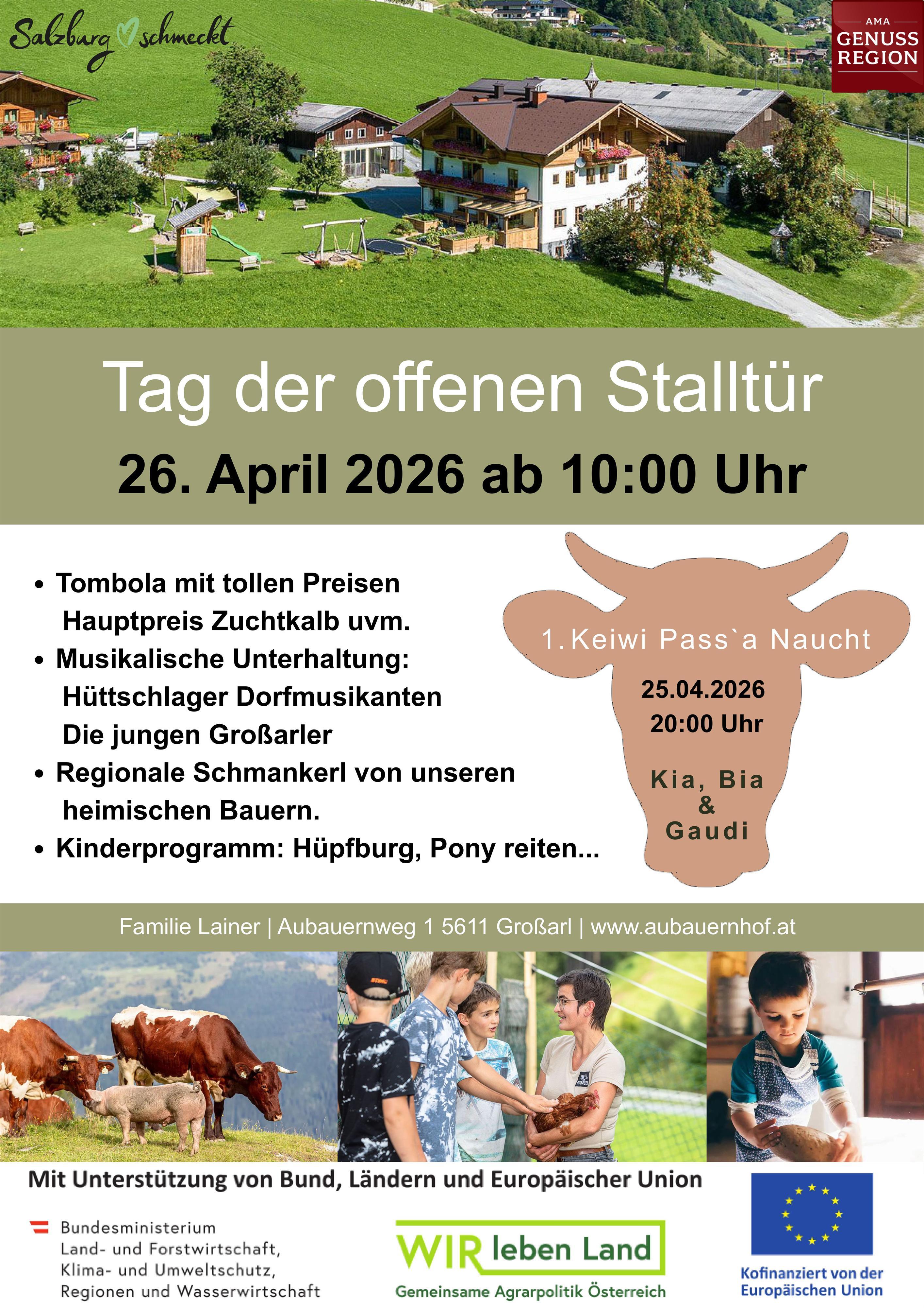 Die Großarler Bäuerinnen & Bauern laden zum „Tag der offenen Stalltür“ am Aubauernhof in Großarl ein. Freuen Sie sich auf musikalische Unterhaltung mit den Hüttschlager Dorfmusikanten & den jungen Großarlern, regionale Schmankerl von den heimischen Bauern, eine Tombola mit tollen Preisen sowie ein tolles Kinderprogramm.