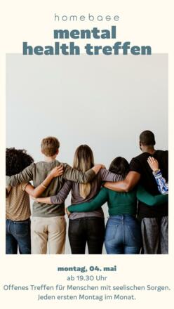 MENTAL HEALTH TREFFEN - Deine Mentale Gesundheit ist auch uns wichtig! Wir haben für jeden ein offenes Ohr, aus diesem Grund laden wir dich herzlich am 01. Juni ab 19 Uhr ein, deine Probleme, Sorgen und Überstehungen oder sogar Erfolge mit uns oder anderen mitzuteilen. Wir wollen für alle eine gastfreundliche Wohlfühl-Atmosphäre anbieten und euch das Gefühl geben, dass ihr nicht alleine seid. Es ist ein offenes Treffen in der Homebase, daher keine Anmeldungen nötig. Schaut vorbei und traut euch!