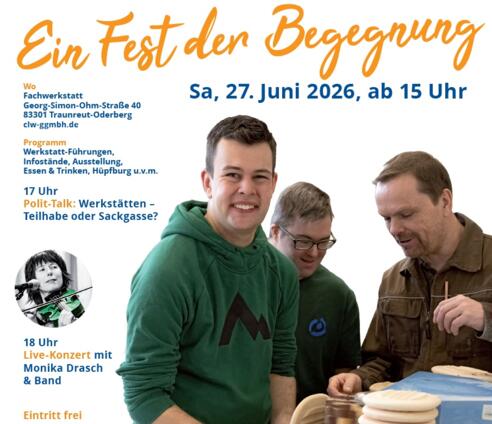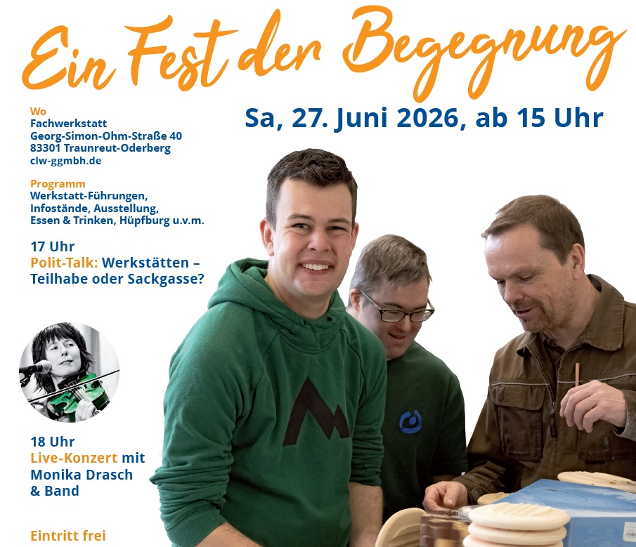 Was ist dran an der öffentlichen Kritik an Werkstätten für behinderte Menschen (WfbM)? Was bedeutet Leben und Arbeiten im Chiemgau für einen Menschen mit einer geistigen oder seelischen Behinderung? Mit einem bunten und informativen Programm für die ganze Familie (samt leckerem Essen&Trinken und Hüpfburg für die Kleinen) wollen wir es euch zeigen! Kommt vorbei, lernt uns alle kennen: Die Chiemgau-Lebenshilfe-Werkstätten gGmbH gehören mit der Lebenshilfe Traunstein gGmbH zum Verein der Lebenshilfe Transtein e.V..
