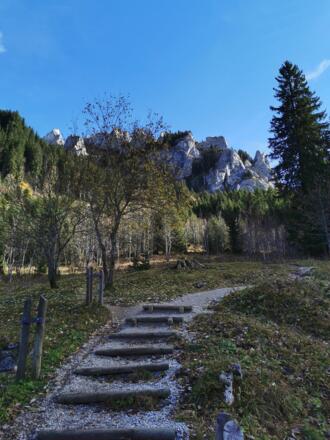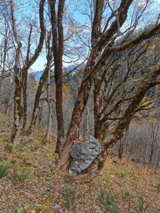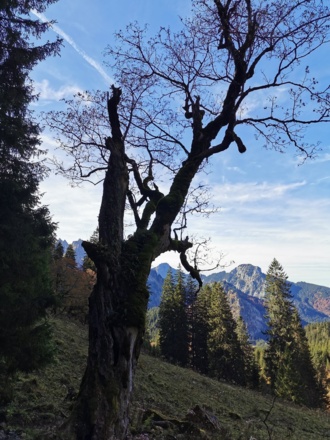 Vom Sägertalparkplatz folgen wir auf einem Forstweg dem malerischen Sägertalbach, der sich hier zwischen Felsen und buntem Mischwald durchs Tal windet. Nach etwa einer Stunde geht die Forsstraße in eine schmälere Fahrstraße über, die sich in Serpentinen jetzt langsam den Berg hochschlängelt. An einer Wegkreuzung, die wir nach etwa einer halben Stunde erreichen folgen wir dem Wanderweg Richtung Bäckenalmsattel/Kenzenhütte. Jetzt beginnt ein schöner kleiner Wanderweg, der oberhalb des Bachs am Hang entlangführt. Nach kurzer Zeit kreuzen wir den Bach und erreichen einen kleinen Waldbereich, der überwiegend aus jungen Ahornen besteht. Hier finden wir ein paar eindrucksvolle Zeichen, welche Bedeutung der Wald als Erosionsschutz einnehmen kann.