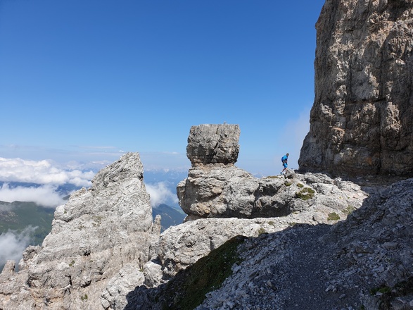 Für erfahrene Bergsteiger auch ohne Klettersteigset machbar, ein Helm sollte jedoch auf jeden Fall dabei sein.