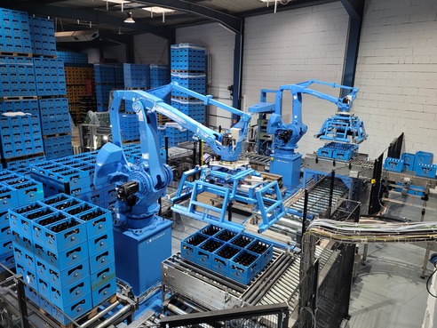 In einer Rekordzeit von drei Wochen und einem Invest von rund 750.000 € wurde nun die Palettierungsanlage der Brauerei komplett ab- und neu wieder aufgebaut. Zwei moderne „tragerlblaue“ Roboter greifen mit ihren Armen die Bierträger und setzen unermüdlich Lage um Lage aufeinander.