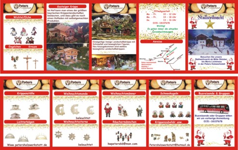 Der" weihnachtliche Werkstattverkauf der Peters Holzwerkstatt" und "Oberbayerns größte Krippenlandschaft" ist ab Mitte Oktober bis Lichtmess (2. Februar) in Gasteig(nähe Höfen) bei Gars wieder zu besichtigen.